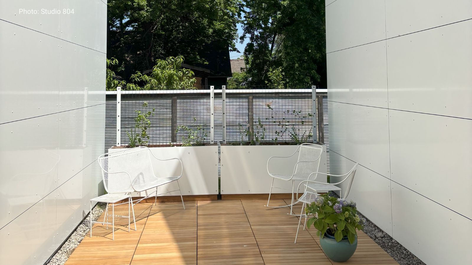 ALPOLIC donated over two thousand square feet of RVW White MCM to the project through its Operation Encore program. All fabrication and installation of the ALPOLIC was handled by the architectural students, who ensured that the wooden frame and sub assembly with hat channels were able to keep the MCM even. “It was shipped beautifully. Cutting it was super easy,” Berends said of the ALPOLIC panels. During the fabrication process, Berends explained how the Studio 804 team were impressed by the finish. “We took a piece of it outside to look at the gloss levels out in the sun, and it looked great.”
